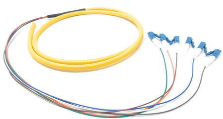 Our 6 Strand Singlemode Pigtails are ideal for use in Optical Distribution Frames, enclosures or cable management boxes. They can be terminated by mechanical or fusion splicing. One end of the cable is blunt, so it can be easily spliced to the trunk, backbone or outside plant cable and the other end is terminated with 6 LC-UPC Connectors which connect to the end equipment, like an adapter panel or optical transceiver. The six, splice-ready 900um buffered cables are color-coded according to industry standards for easy identification and the pre-terminated connectors at the opposite end are machine polished for optimal performance. Each cable is fully inspected and contains a test report. Our pigtails are also available with different connectors, polishes, strand counts and styles; like armored and waterproof.