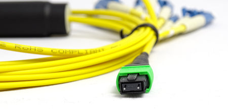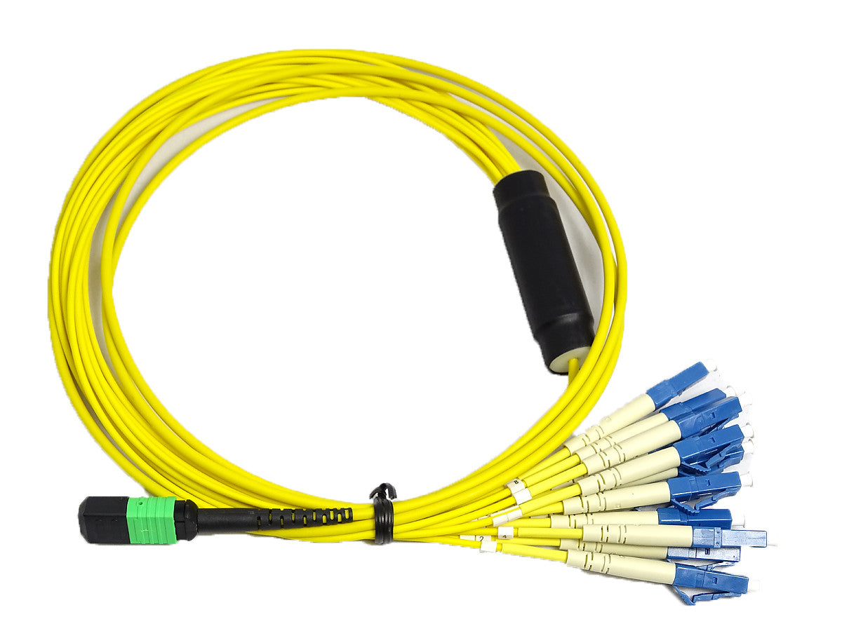 12 strand fiber cable with one MPO connector on one end and 12 LC connectors on the other.