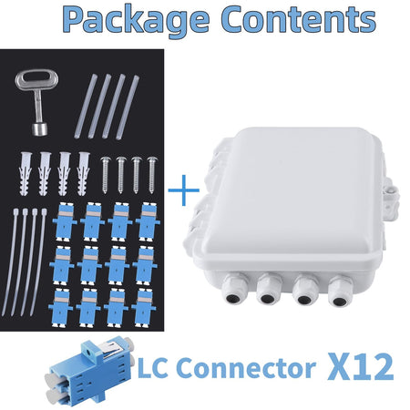 - Suitable Size: 260 * 225 * 85mm, simple structure, easy to operate; the package content includes: 1x12 12 ports FTTH optical fiber distribution box; 12x LC optical fiber plugs; installation accessories