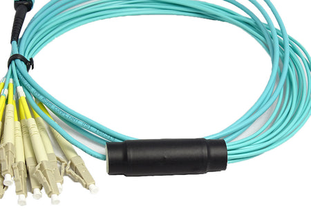 12 strand fiber cable with one MPO connector on one end and 12 LC connectors on the other.