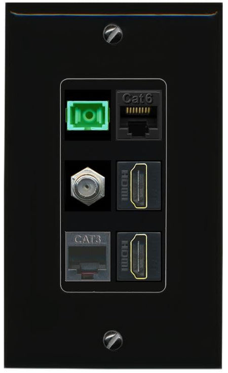 RiteAV 1 Port Fiber Optic Jack SC Simplex APC + Cat6 + Coax + 2 x HDMI + Phone Wall Plate-1 Gang Black/Black