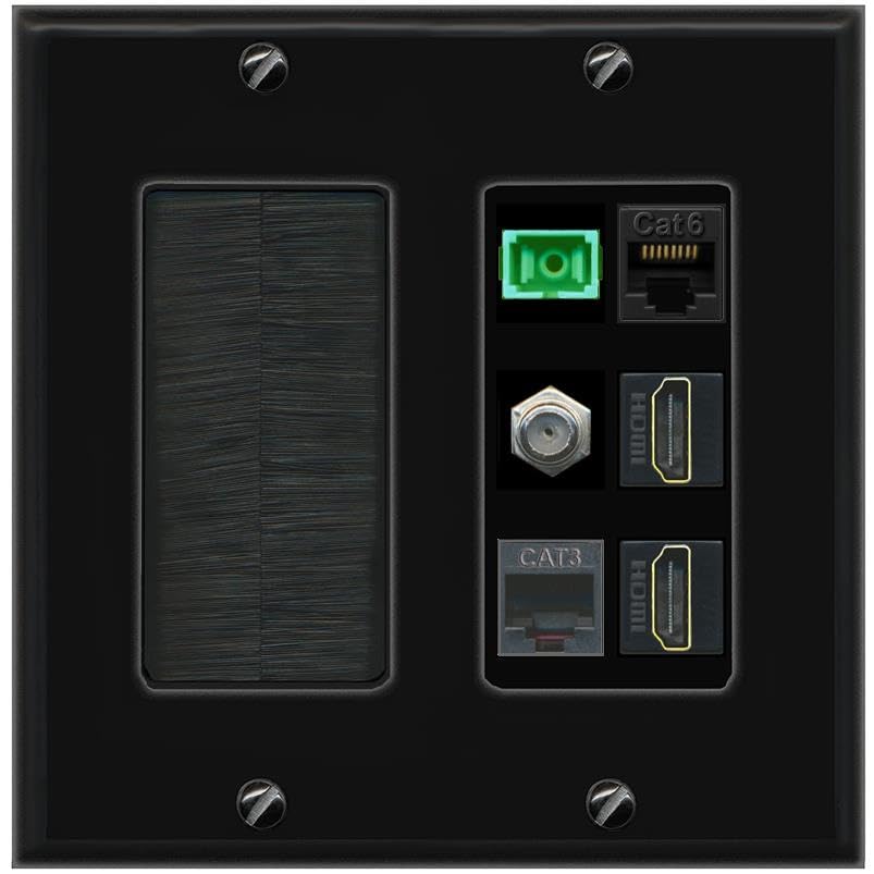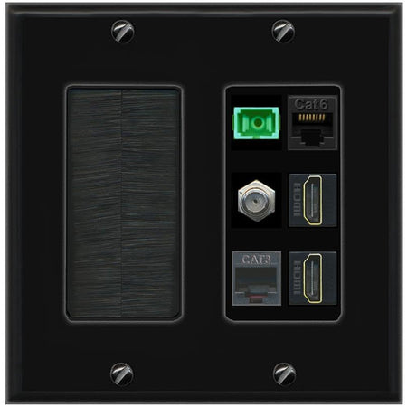 RiteAV 1 Port Fiber Optic Jack SC Simplex APC + Cat6 + Coax + 2 x HDMI + Phone Wall Plate-Brush Black/Black