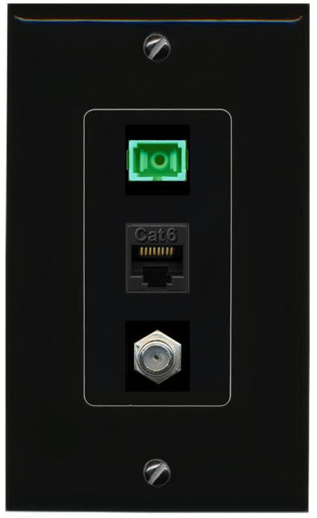 RiteAV 1 Port Fiber Optic Jack SC Simplex APC + Cat6 + Coax Wall Plate-1 Gang Black/Black