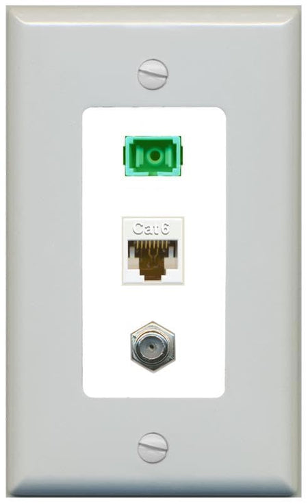 RiteAV 1 Port Fiber Optic Jack SC Simplex APC + Cat6 + Coax Wall Plate-1 Gang Gray/White