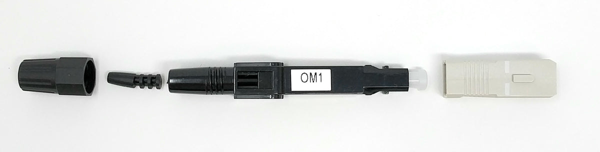 Field Installable SC-UPC Multimode OM1 Connectors simplify the fiber termination process by offering a quick and simple solution to onsite installations, hybrid solutions, routine maintenance or emergency repairs. The user-friendly connectors are pre-stubbed with a machine polished ferrule, so there's no need for hand polishing in the field. The fiber is aligned using precision splice technology and index-matching gel to yield low insertion loss, high return loss and exceptional performance. The hassle-free connectors eliminate the need for epoxy, splicing, polishing and heating, without sacrificing reliable and consistent transmission parameters where standard polish/splice technologies are employed. The connectors also provide great flexibility by accommodating three different cordage sizes (0.9mm, 2.0mm and 3.0mm), saving both space in your tool bag and the expense of purchasing a variety of diameters to complete particular tasks. A quick assembly guide is included that provides step by step visual/written instructions to complete the terminations in very little time. No power is required and only standard fiber preparation tools are needed. This convenient, cost-effective, time-saving solution is perfect for Metro/Access/Local Area/CATV and Data Processing Networks. FTTX/FTTH applications and standards are achieved for both optical and mechanical performance after proper termination and a VFL can be used to confirm optical continuity. We also offer LC and FC Field Installable Connectors, Bulk Fiber Optic Cable and Fiber Cleaning Products.