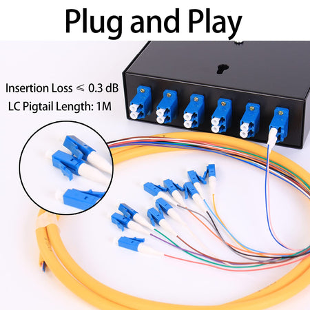 - 【6 Duplex LC-UPC Kit】Wall Mount Fiber Enclosure with Spool 12 Strands 1 Meter LC Pigtail, Fiber Type SingleMode 9/125;★ Different types of connectors and different lengths can be selected,thus flexible Protect and organize fiber connections, Standards Conformed to: YD/T926I; SO/IEC 11801;TIA/EIA-568-B.
